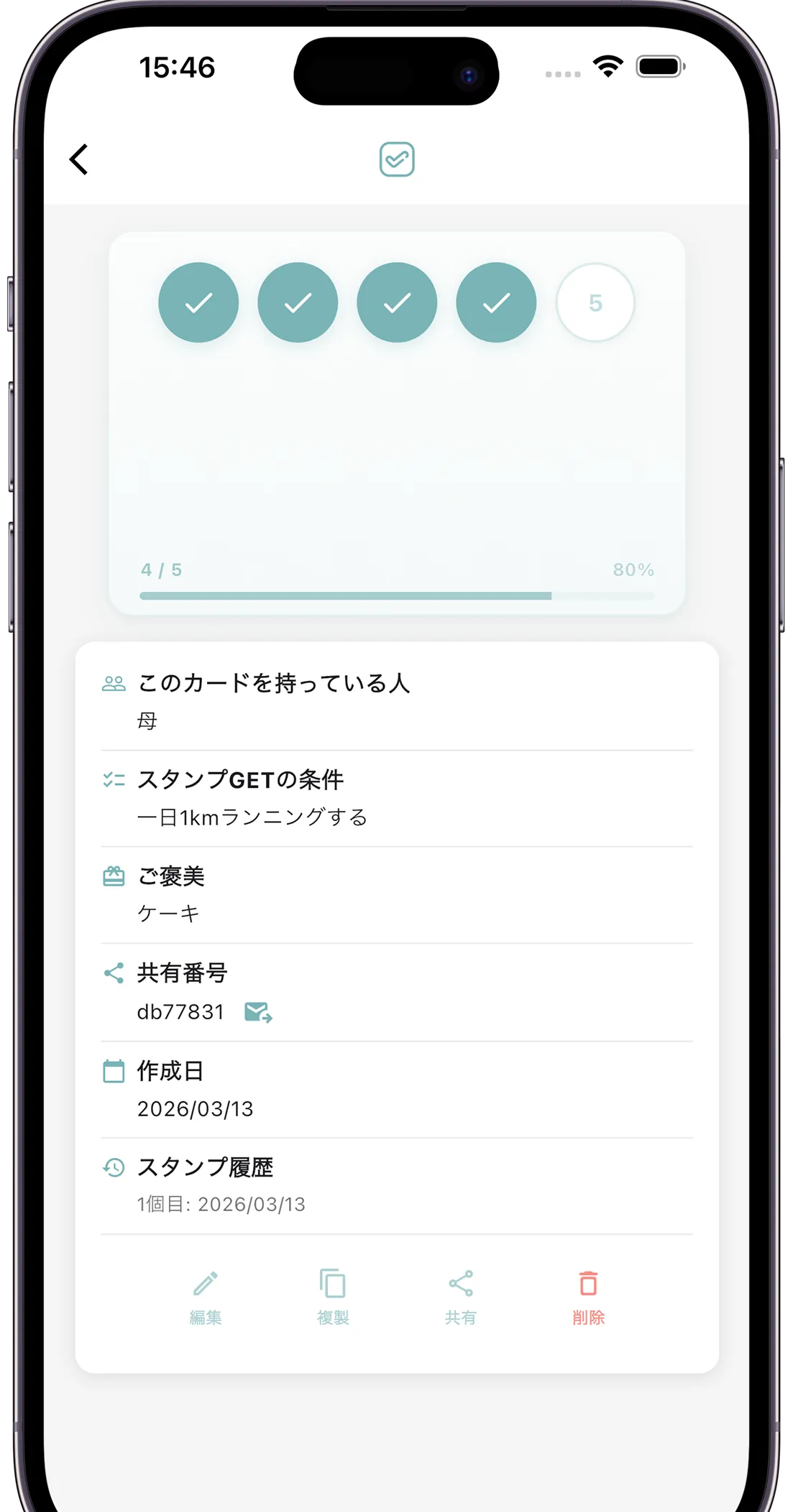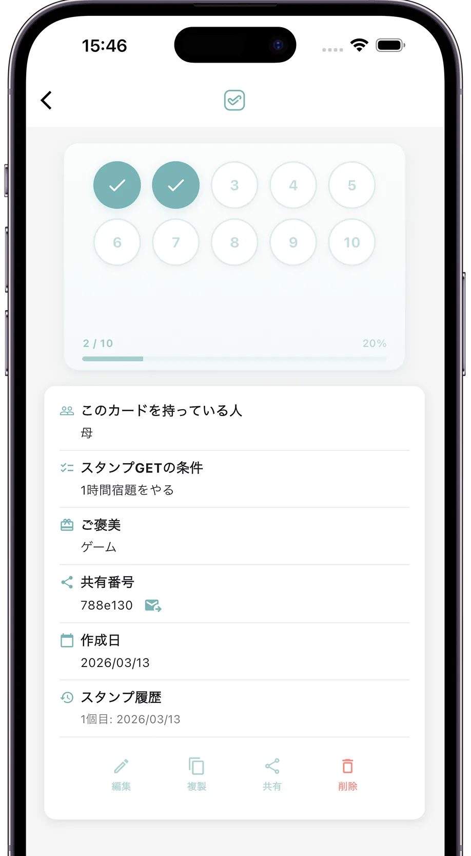 カード名、スタンプ数、デザインを自由に設定して、あなただけのオリジナルスタンプカードを作成。お手伝い、勉強、運動など用途に合わせて複数のカードを作れます。