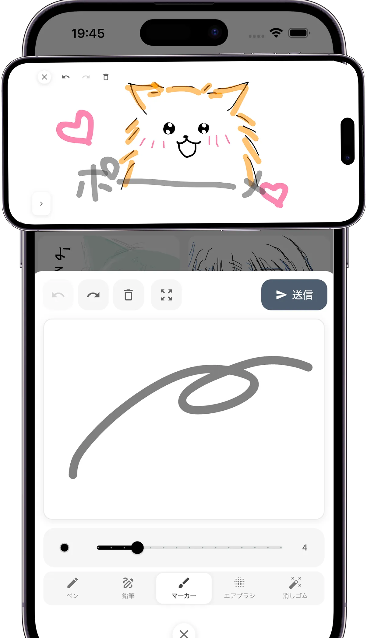 ペン・マーカー・エアブラシなど多彩な描画ツールで、テキストでは伝えられない気持ちをイラストや手書き文字で表現。昔懐かしいピクトチャットのような楽しさをスマホで体験できます。
