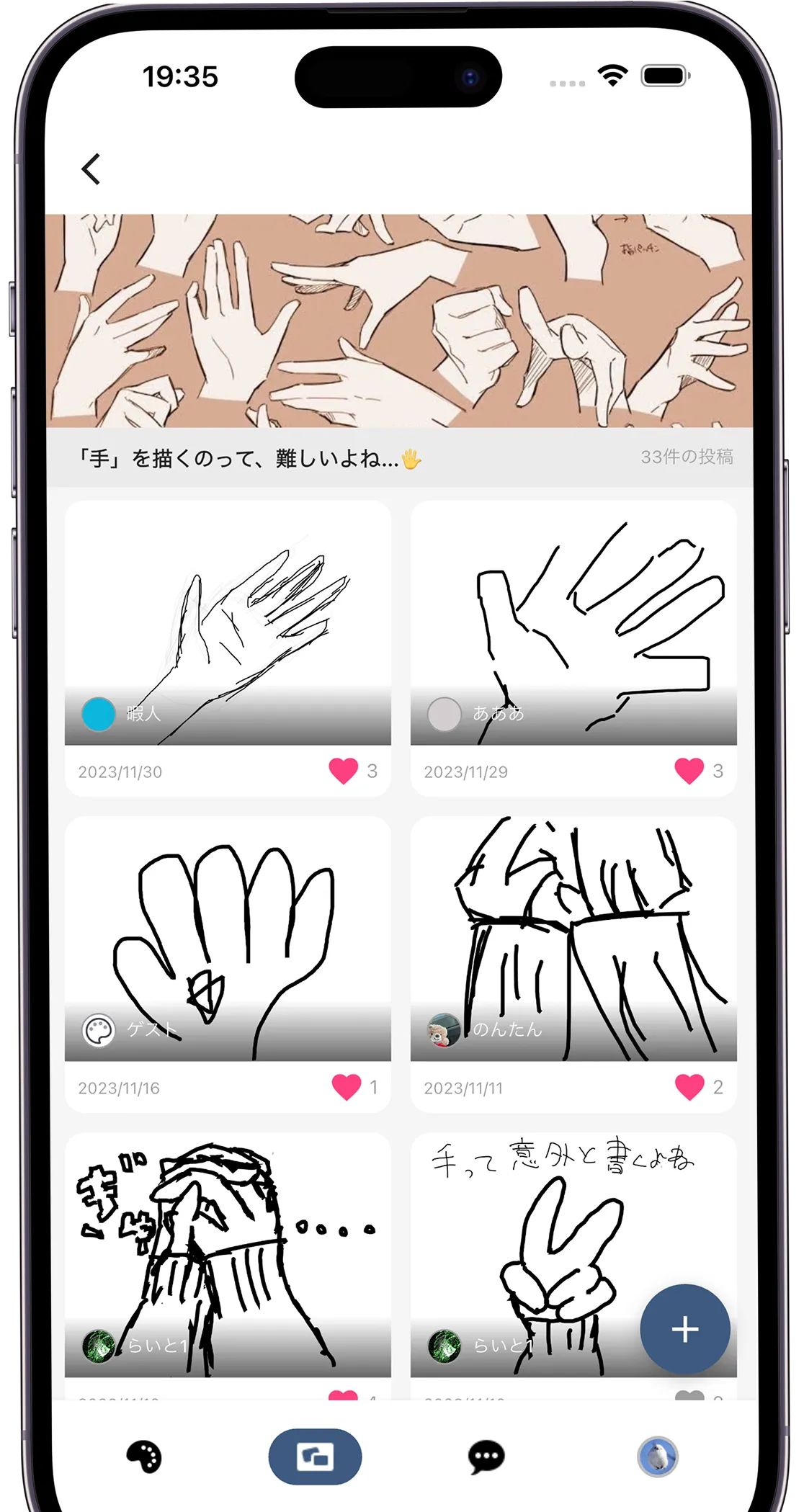 全ユーザーの投稿がタイムラインに流れるギャラリー機能。個性豊かなイラストを眺めたり、お気に入りのクリエイターを見つけたり。見るだけでも楽しいSNSです。